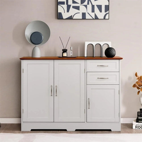A storage cabinet with a wood grain finish and round door handles, designed specifically for storing tableware, glassware, and small appliances.